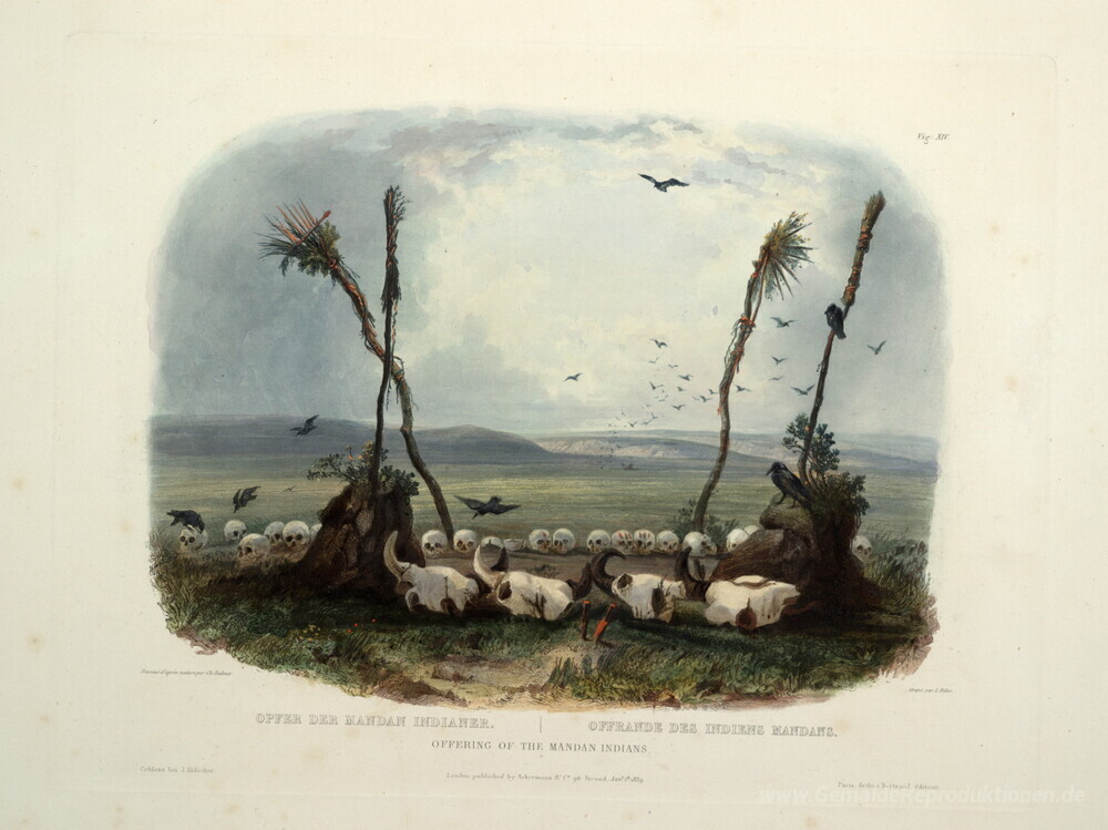 Wir bieten Ihnen eine handgefertigte Reproduktion auf Leinwand des berühmten Kunstwerks 'Angebot der Mandan-Indianer, Platte 14 aus Band 1 der "Reise in ' von Karl Bodmer, aus dem Reproduktionsmuseum.