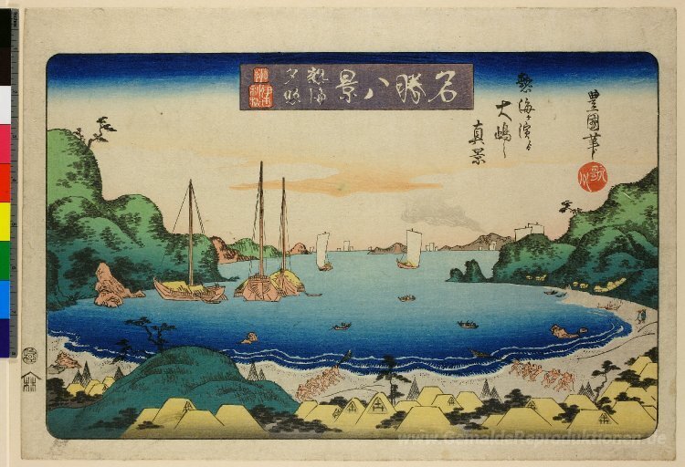Wir bieten Ihnen eine handgefertigte Reproduktion auf Leinwand des berühmten Kunstwerks 'Ansicht von Oshima von Atami Strand' von Utagawa Toyokuni II, aus dem Reproduktionsmuseum.