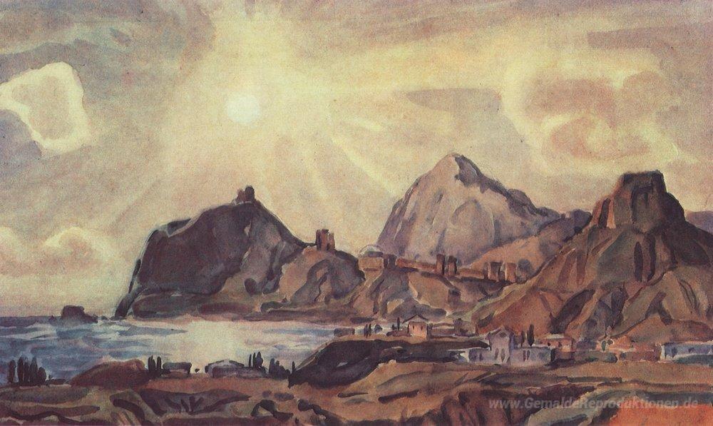 Wir bieten Ihnen eine handgefertigte Reproduktion auf Leinwand des berühmten Kunstwerks 'Ansicht von Sudak' von Konstantin Bogaevsky, aus dem Reproduktionsmuseum.