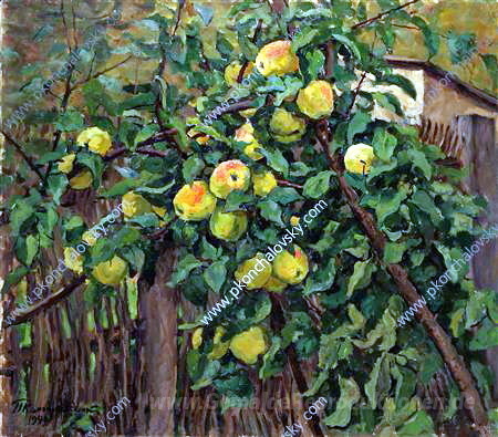 Wir bieten Ihnen eine handgefertigte Reproduktion auf Leinwand des berühmten Kunstwerks 'Apfelbaum durch den Zaun' von Pyotr Konchalovsky, aus dem Reproduktionsmuseum.