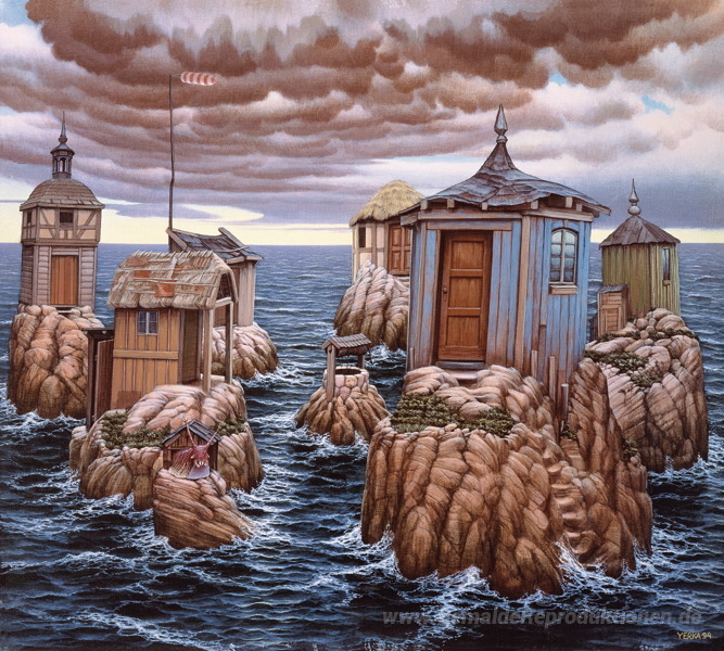Wir bieten Ihnen eine handgefertigte Reproduktion auf Leinwand des berühmten Kunstwerks 'Archipelag' von Jacek Yerka, aus dem Reproduktionsmuseum.