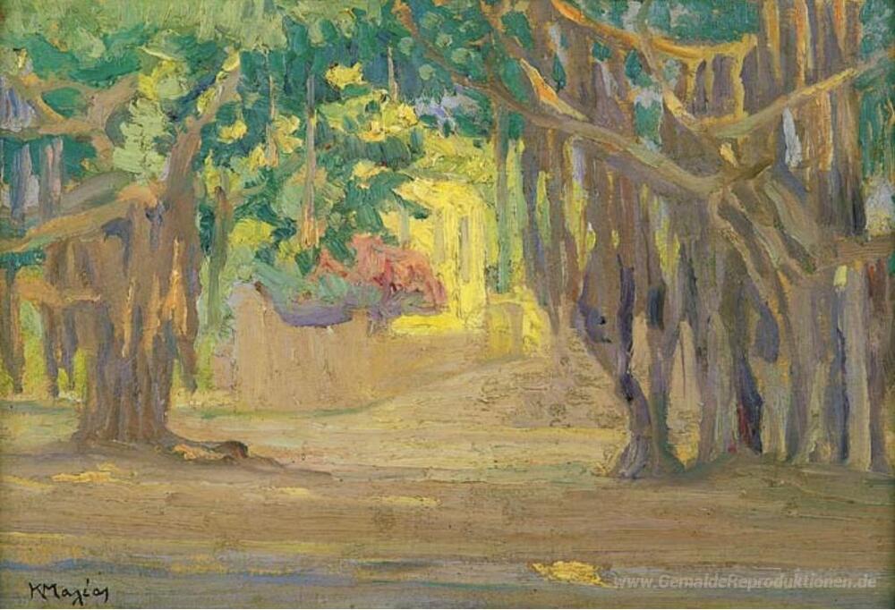 Wir bieten Ihnen eine handgefertigte Reproduktion auf Leinwand des berühmten Kunstwerks 'Bäume in Kairo' von Constantine Maleas, aus dem Reproduktionsmuseum.