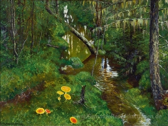 Wir bieten Ihnen eine handgefertigte Reproduktion auf Leinwand des berühmten Kunstwerks 'Bækken' von Theodor Severin Kittelsen, aus dem Reproduktionsmuseum.