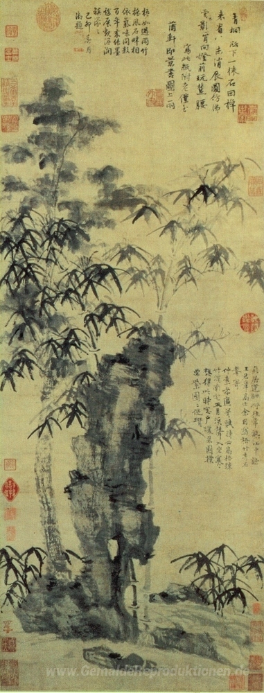 Wir bieten Ihnen eine handgefertigte Reproduktion auf Leinwand des berühmten Kunstwerks 'Bambus und eleganten Stein' von Ni Zan, aus dem Reproduktionsmuseum.