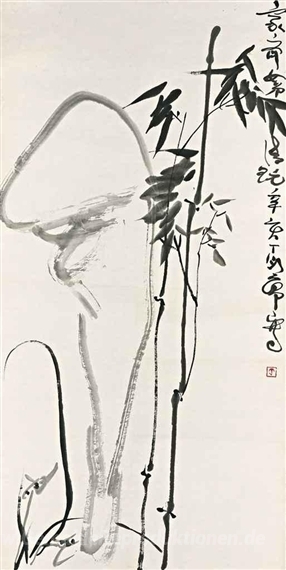 Wir bieten Ihnen eine handgefertigte Reproduktion auf Leinwand des berühmten Kunstwerks 'Bambus und Felsen' von Ding Yanyong, aus dem Reproduktionsmuseum.