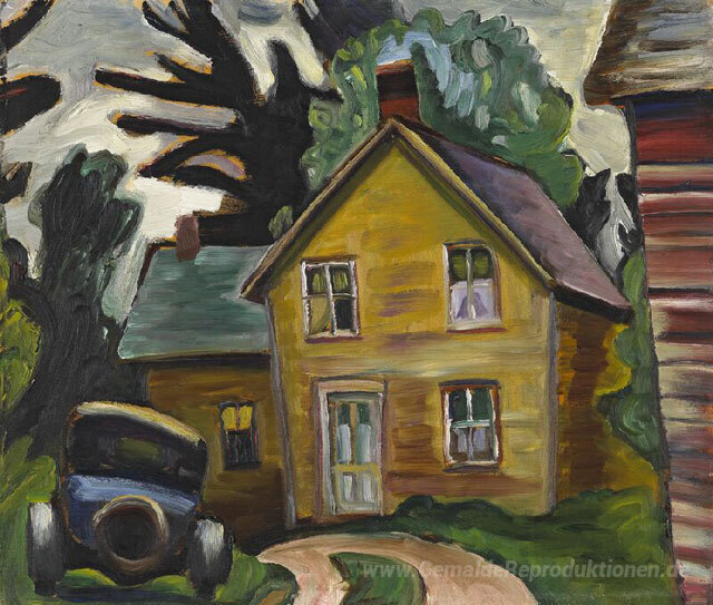 Wir bieten Ihnen eine handgefertigte Reproduktion auf Leinwand des berühmten Kunstwerks 'Bauernhaus und Auto' von Prudence Heward, aus dem Reproduktionsmuseum.