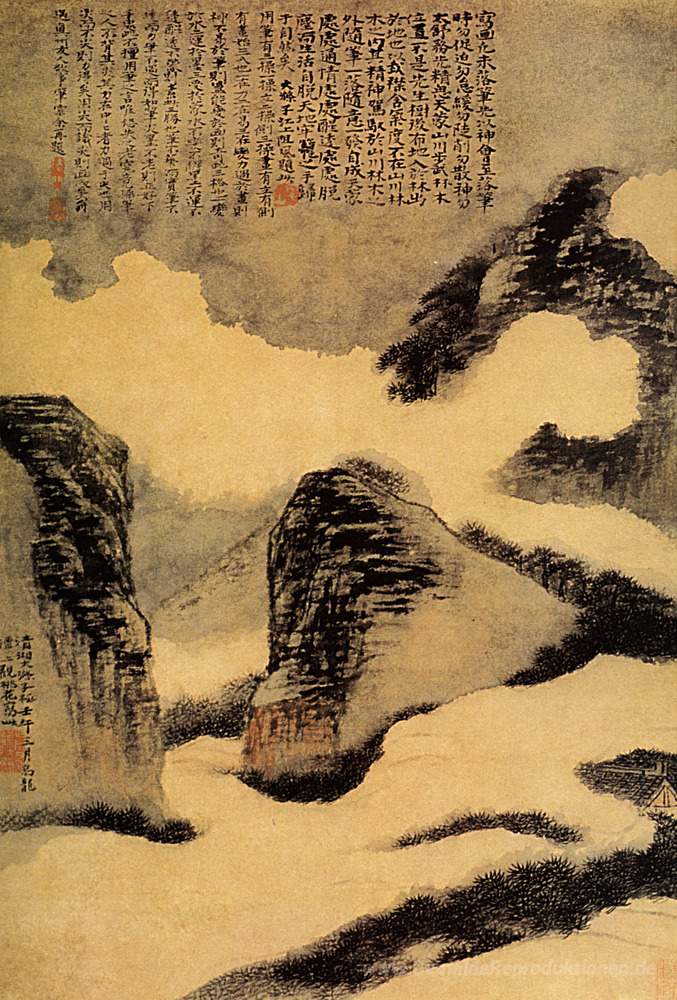 Wir bieten Ihnen eine handgefertigte Reproduktion auf Leinwand des berühmten Kunstwerks 'Berge im Nebel' von Shitao, aus dem Reproduktionsmuseum.
