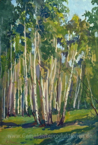 Wir bieten Ihnen eine handgefertigte Reproduktion auf Leinwand des berühmten Kunstwerks 'Birches at Noon' von Konstantin Yuon, aus dem Reproduktionsmuseum.
