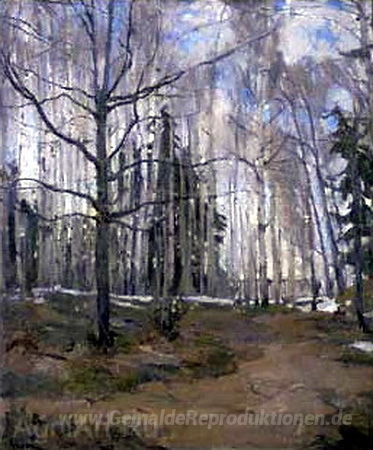 Wir bieten Ihnen eine handgefertigte Reproduktion auf Leinwand des berühmten Kunstwerks 'Birken-Wald' von Konstantin Yuon, aus dem Reproduktionsmuseum.