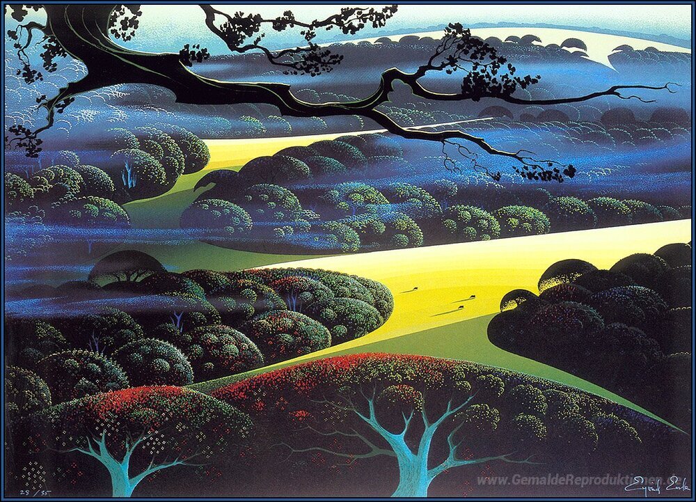 Wir bieten Ihnen eine handgefertigte Reproduktion auf Leinwand des berühmten Kunstwerks 'Blauer Nebel' von Eyvind Earle, aus dem Reproduktionsmuseum.