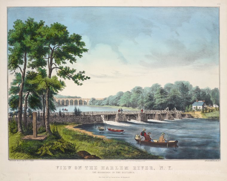Wir bieten Ihnen eine handgefertigte Reproduktion auf Leinwand des berühmten Kunstwerks 'Blick auf den Harlem River' von Currier and Ives, aus dem Reproduktionsmuseum.