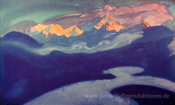 Wir bieten Ihnen eine handgefertigte Reproduktion auf Leinwand des berühmten Kunstwerks 'Blick auf Kangchenjunga von Turpindar' von Nicholas Roerich, aus dem Reproduktionsmuseum.