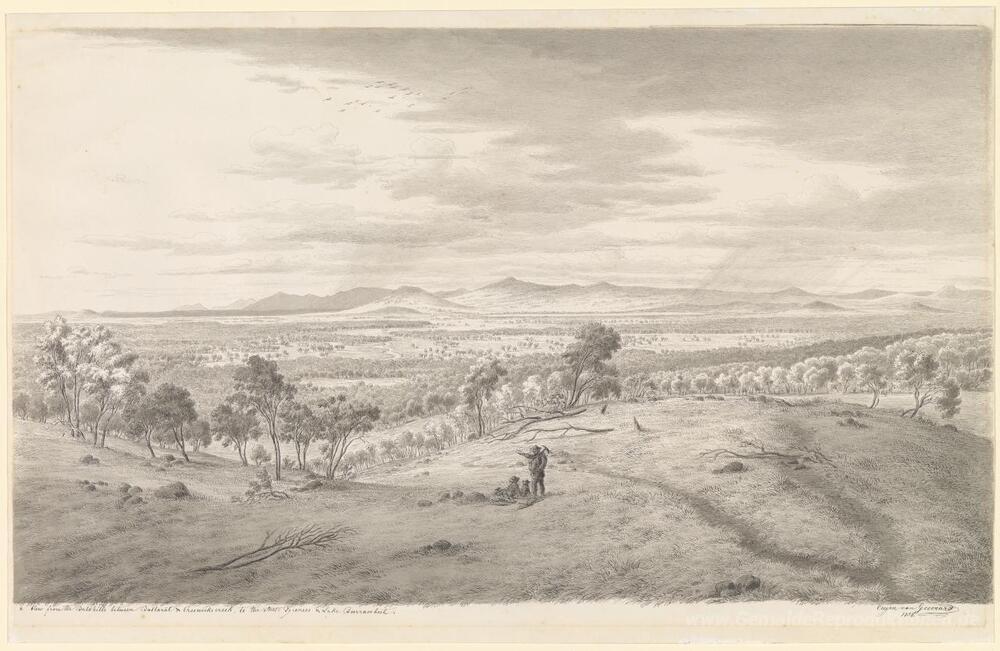 Wir bieten Ihnen eine handgefertigte Reproduktion auf Leinwand des berühmten Kunstwerks 'Blick von der Bald Hills zwischen Ballarat und Creswick Creek, w' von Eugene von Guerard, aus dem Reproduktionsmuseum.