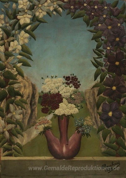 Wir bieten Ihnen eine handgefertigte Reproduktion auf Leinwand des berühmten Kunstwerks 'Blumen in Landschaft' von Andre Bauchant, aus dem Reproduktionsmuseum.