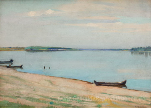 Wir bieten Ihnen eine handgefertigte Reproduktion auf Leinwand des berühmten Kunstwerks 'Boote am Ufer der Donau' von Constantin Artachino, aus dem Reproduktionsmuseum.