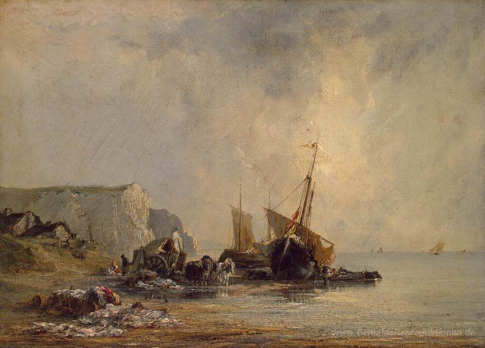 Wir bieten Ihnen eine handgefertigte Reproduktion auf Leinwand des berühmten Kunstwerks 'Boote von der Normandie Shore' von Richard Parkes Bonington, aus dem Reproduktionsmuseum.