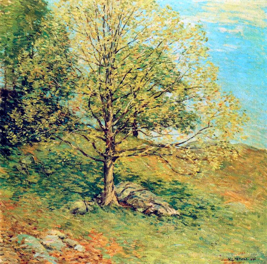 Wir bieten Ihnen eine handgefertigte Reproduktion auf Leinwand des berühmten Kunstwerks 'Budding Oak' von Willard Metcalf, aus dem Reproduktionsmuseum.