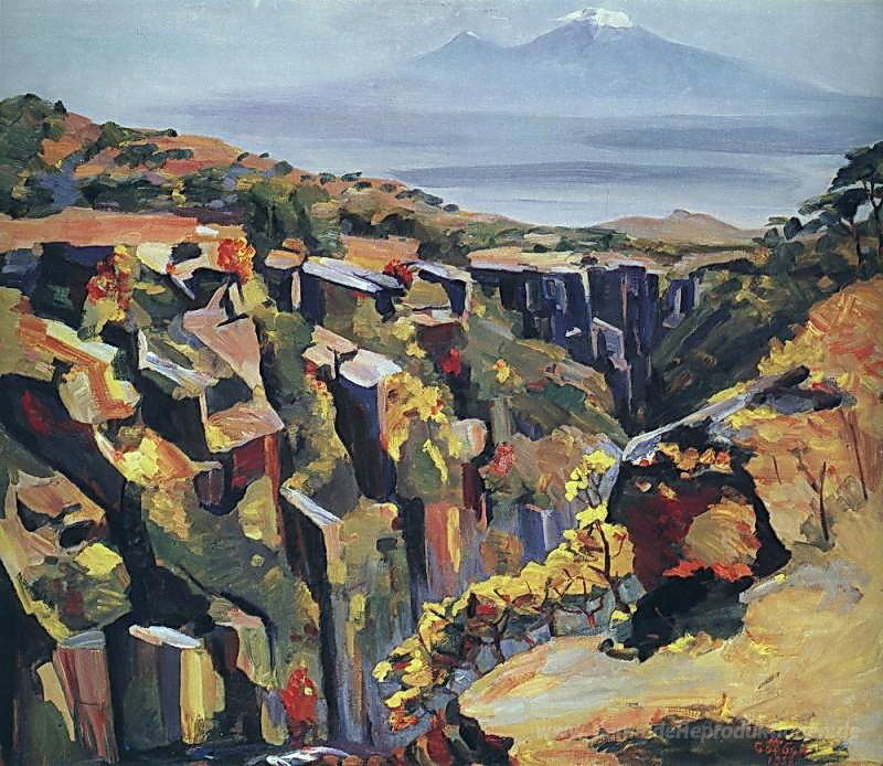 Wir bieten Ihnen eine handgefertigte Reproduktion auf Leinwand des berühmten Kunstwerks 'Cliff in der Steigung des Aragats' von Martiros Saryan, aus dem Reproduktionsmuseum.