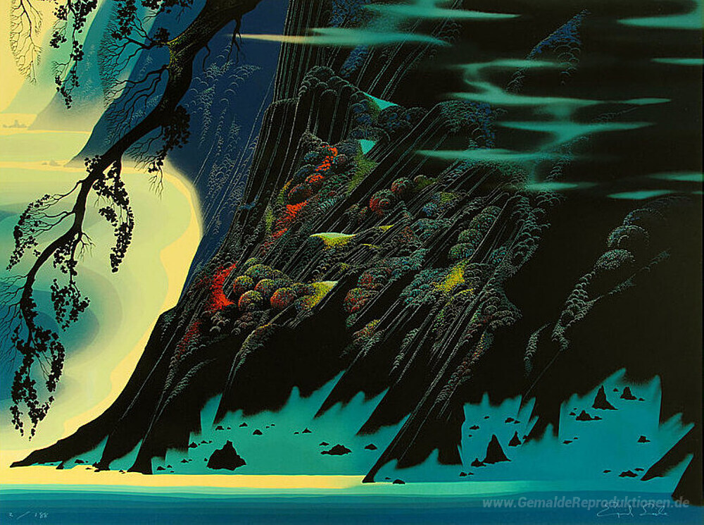 Wir bieten Ihnen eine handgefertigte Reproduktion auf Leinwand des berühmten Kunstwerks 'Coastal Magie' von Eyvind Earle, aus dem Reproduktionsmuseum.