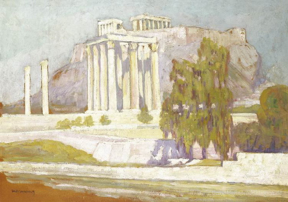 Wir bieten Ihnen eine handgefertigte Reproduktion auf Leinwand des berühmten Kunstwerks 'Columns' von Constantine Maleas, aus dem Reproduktionsmuseum.