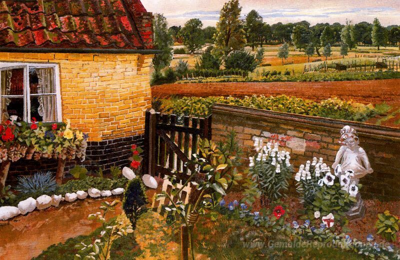 Wir bieten Ihnen eine handgefertigte Reproduktion auf Leinwand des berühmten Kunstwerks 'Cottage am Wangford' von Stanley Spencer, aus dem Reproduktionsmuseum.