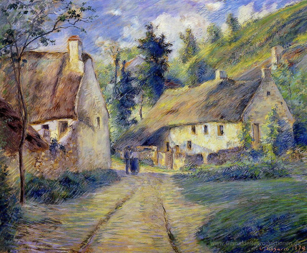 Wir bieten Ihnen eine handgefertigte Reproduktion auf Leinwand des berühmten Kunstwerks 'Cottages at Auvers, in der Nähe von Pontoise' von Camille Pissarro, aus dem Reproduktionsmuseum.