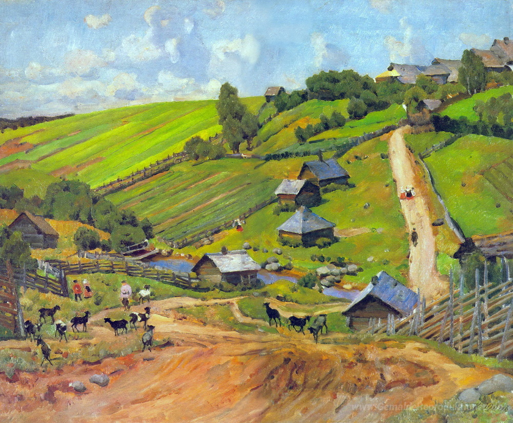 Wir bieten Ihnen eine handgefertigte Reproduktion auf Leinwand des berühmten Kunstwerks 'Das Dorf von Novgorod Governorate' von Konstantin Yuon, aus dem Reproduktionsmuseum.