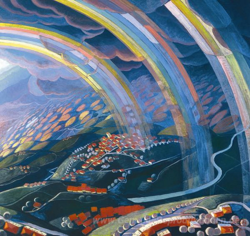 Wir bieten Ihnen eine handgefertigte Reproduktion auf Leinwand des berühmten Kunstwerks 'Das Wunder des Lichts während des Fluges' von Gerardo Dottori, aus dem Reproduktionsmuseum.