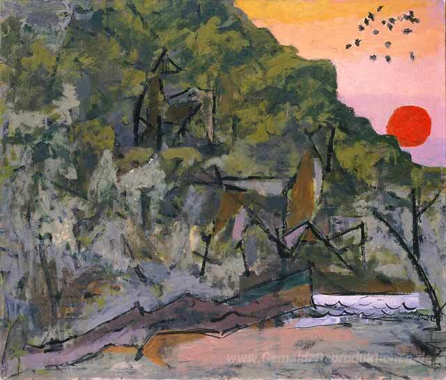 Wir bieten Ihnen eine handgefertigte Reproduktion auf Leinwand des berühmten Kunstwerks 'Deer in Sunset' von Karl Knaths, aus dem Reproduktionsmuseum.