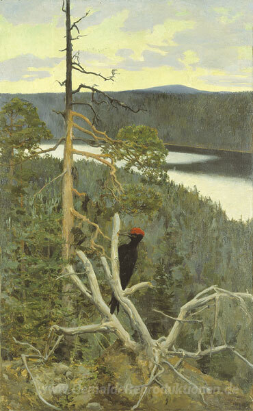 Wir bieten Ihnen eine handgefertigte Reproduktion auf Leinwand des berühmten Kunstwerks 'Die Große Schwarzspecht' von Akseli Gallen-Kallela, aus dem Reproduktionsmuseum.