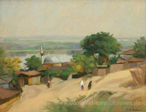 Wir bieten Ihnen eine handgefertigte Reproduktion auf Leinwand des berühmten Kunstwerks 'Die Moschee in Ada Kaleh' von Constantin Artachino, aus dem Reproduktionsmuseum.