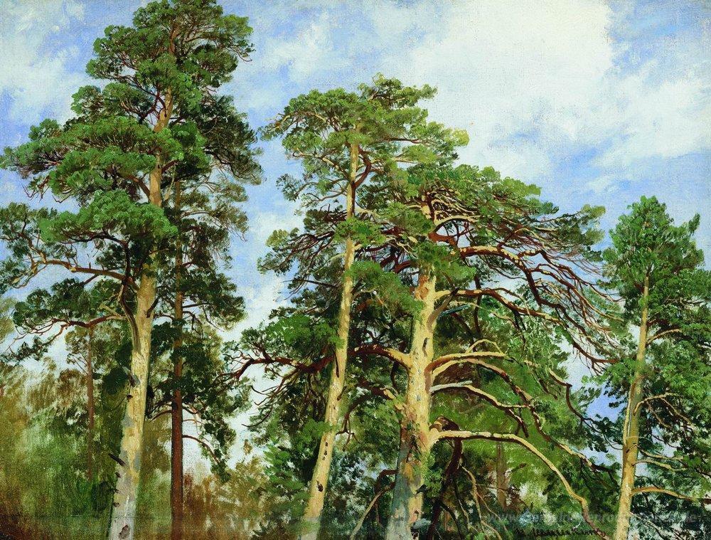 Wir bieten Ihnen eine handgefertigte Reproduktion auf Leinwand des berühmten Kunstwerks 'Die Oberseiten der Kiefern' von Ivan Shishkin, aus dem Reproduktionsmuseum.