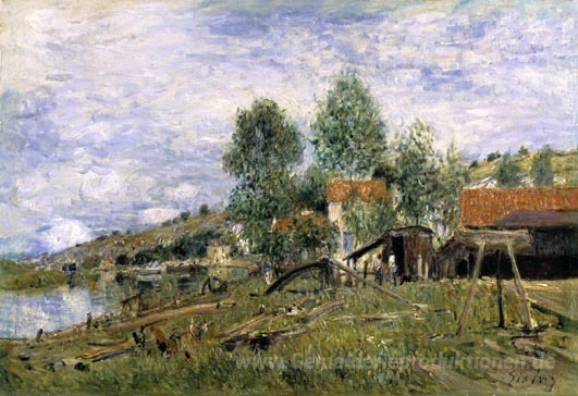 Wir bieten Ihnen eine handgefertigte Reproduktion auf Leinwand des berühmten Kunstwerks 'Die Werft in Saint Mammes' von Alfred Sisley, aus dem Reproduktionsmuseum.