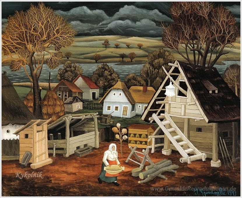 Wir bieten Ihnen eine handgefertigte Reproduktion auf Leinwand des berühmten Kunstwerks 'Dorf Hinterhof' von Ivan Generalic, aus dem Reproduktionsmuseum.