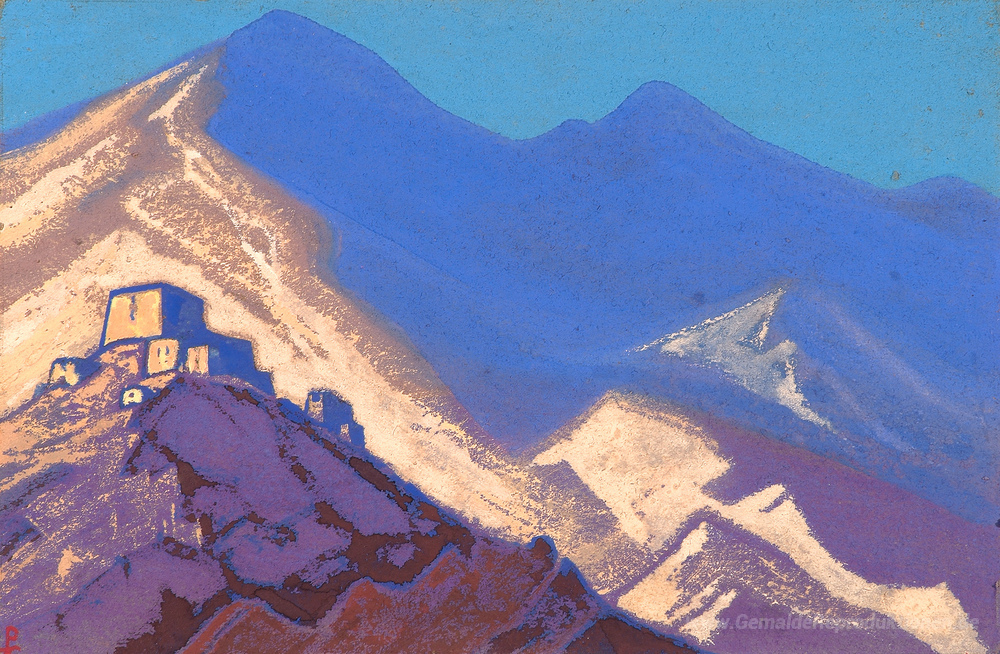 Wir bieten Ihnen eine handgefertigte Reproduktion auf Leinwand des berühmten Kunstwerks 'Dunkelblaue Berge und Gebäude auf dem hiil' von Nicholas Roerich, aus dem Reproduktionsmuseum.