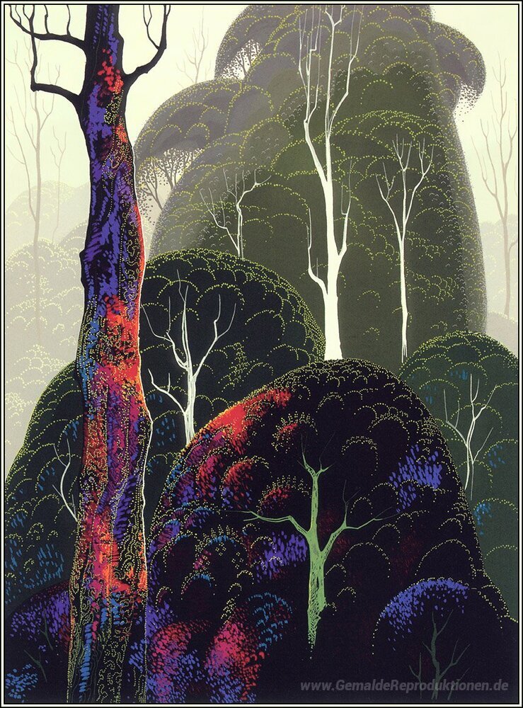 Die künstlerischen Techniken von Eyvind Earle zeichnen sich durch den Einsatz von scharfen Linien und detailreichen Strukturen aus, die eine atmosphärische Tiefe erzeugen. Das Gemälde Early Autumn strahlt eine ruhige Eleganz aus und verwandelt jeden Raum in eine Oase der Inspiration. Lassen Sie sich von der magischen Wirkung dieser Kunstwerke mitreißen und bringen Sie eine zeitlose Schönheit in Ihr Zuhause.