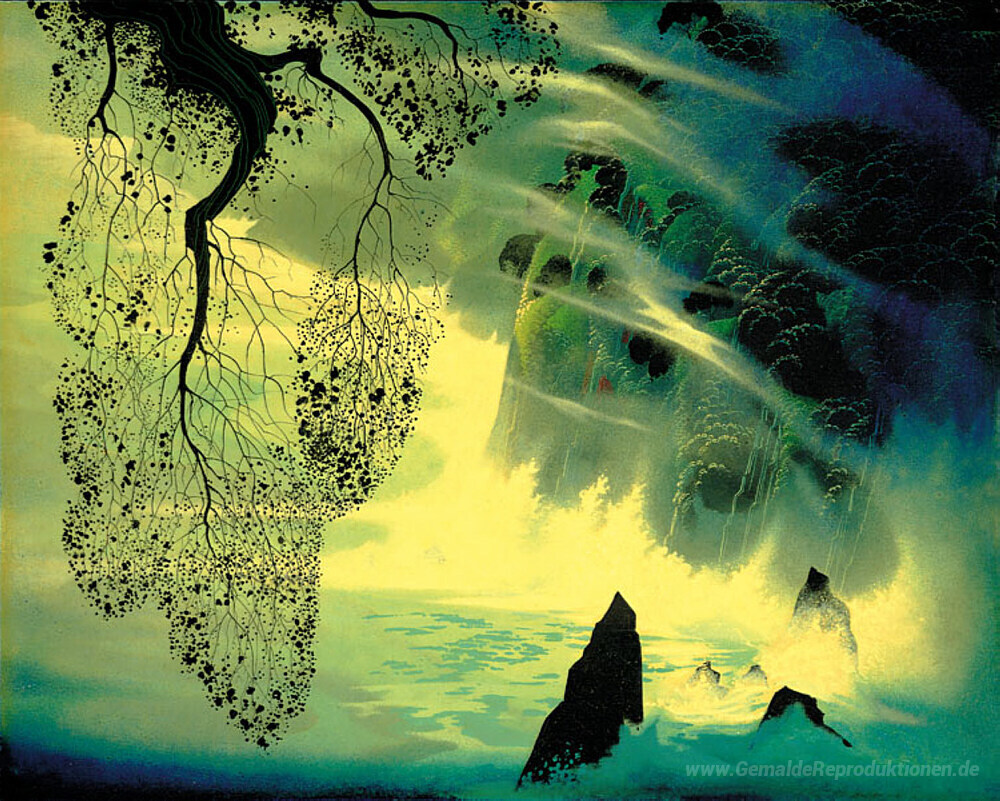 Wir bieten Ihnen eine handgefertigte Reproduktion auf Leinwand des berühmten Kunstwerks 'Ein Strudel der Nebel' von Eyvind Earle, aus dem Reproduktionsmuseum.