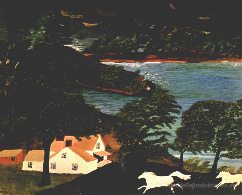 Wir bieten Ihnen eine handgefertigte Reproduktion auf Leinwand des berühmten Kunstwerks 'Ein Sturm auf dem Wasser jetzt' von Grandma Moses, aus dem Reproduktionsmuseum.