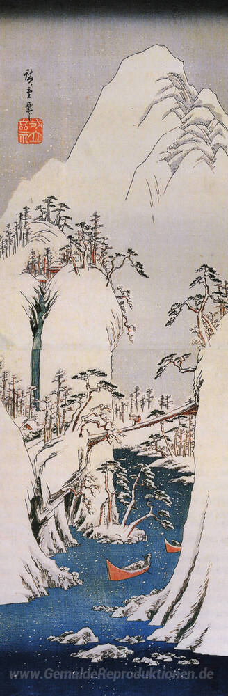 Wir bieten Ihnen eine handgefertigte Reproduktion auf Leinwand des berühmten Kunstwerks 'Eine schneebedeckte Schlucht' von Hiroshige, aus dem Reproduktionsmuseum.