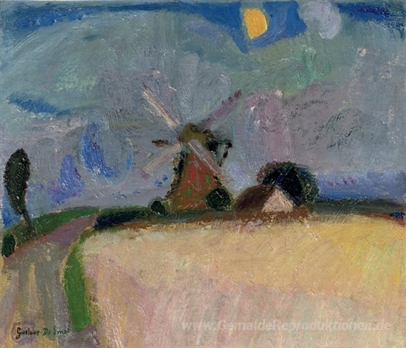 Wir bieten Ihnen eine handgefertigte Reproduktion auf Leinwand des berühmten Kunstwerks 'Eine Windmühle in einer Landschaft, Het Gooi' von Gustave de Smet, aus dem Reproduktionsmuseum.