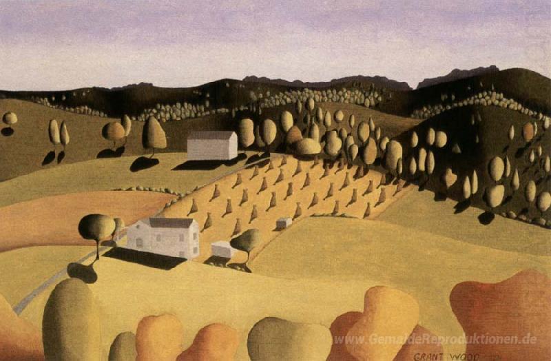 Wir bieten Ihnen eine handgefertigte Reproduktion auf Leinwand des berühmten Kunstwerks 'Einige Mais' von Grant Wood, aus dem Reproduktionsmuseum.