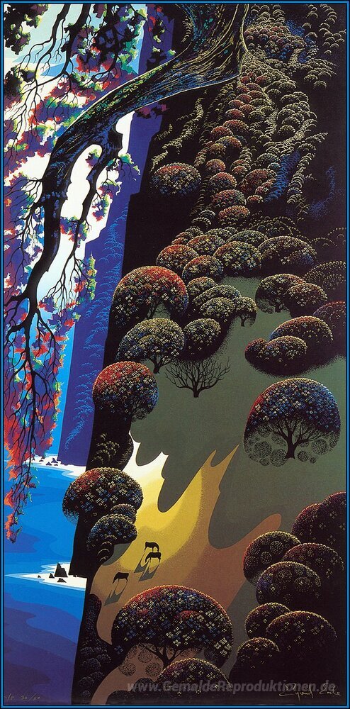 Willkommen in unserer exquisiten Kollektion von Ölgemälden, wo jedes Kunstwerk eine Geschichte erzählt. Eines der herausragenden Werke ist Enchanted Coast von dem renommierten Künstler Eyvind Earle. Earle, bekannt für seinen einzigartigen Stil, verbindet traumhafte Landschaften mit lebendigen Farben und detaillierten Formen, wodurch eine Atmosphäre der Ruhe und Besinnlichkeit entsteht.