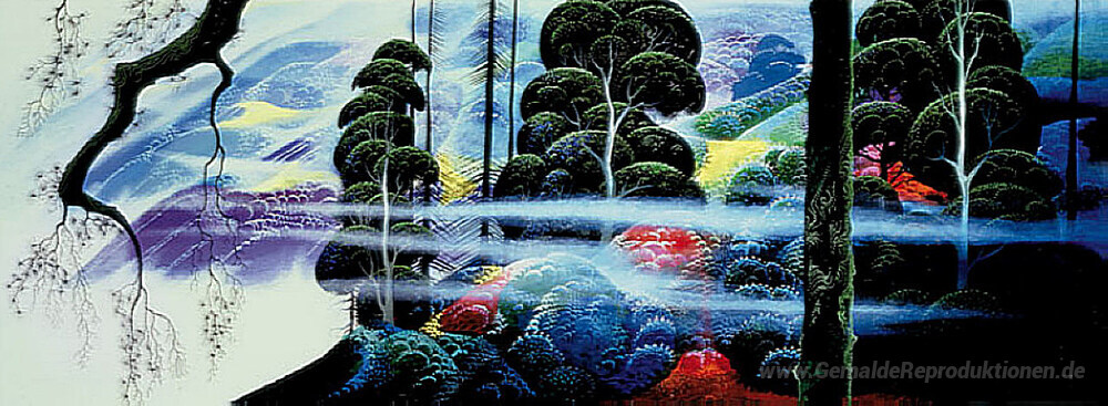 Wir bieten Ihnen eine handgefertigte Reproduktion auf Leinwand des berühmten Kunstwerks 'Entlang der Küste' von Eyvind Earle, aus dem Reproduktionsmuseum.