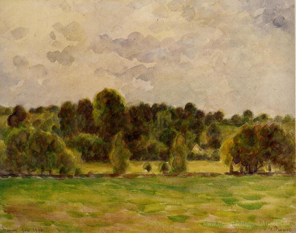 Wir bieten Ihnen eine handgefertigte Reproduktion auf Leinwand des berühmten Kunstwerks 'Eragny, Dämmerung' von Camille Pissarro, aus dem Reproduktionsmuseum.