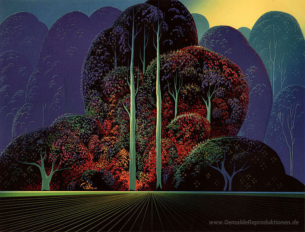 Wir bieten Ihnen eine handgefertigte Reproduktion auf Leinwand des berühmten Kunstwerks 'Erweichung Shades of Twilight' von Eyvind Earle, aus dem Reproduktionsmuseum.