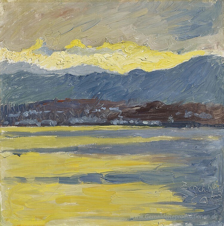 Wir bieten Ihnen eine handgefertigte Reproduktion auf Leinwand des berühmten Kunstwerks 'Föhnstimmung (Zürichsee)' von Cuno Amiet, aus dem Reproduktionsmuseum.