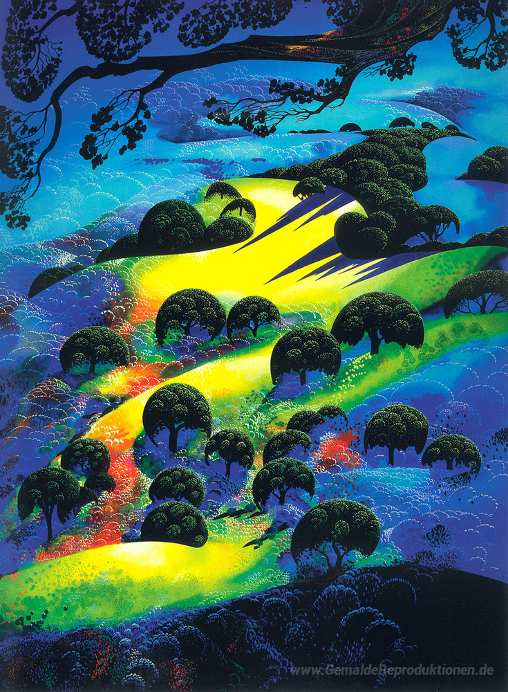 Wir bieten Ihnen eine handgefertigte Reproduktion auf Leinwand des berühmten Kunstwerks 'Fading Sunset Flamme' von Eyvind Earle, aus dem Reproduktionsmuseum.
