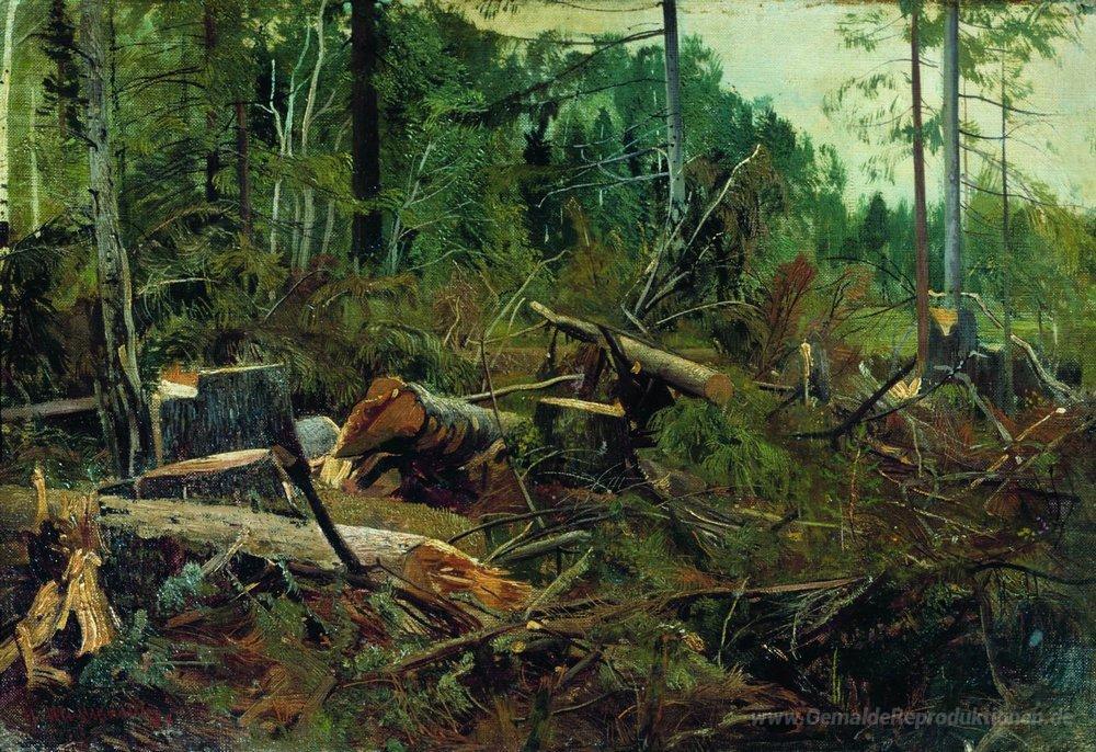 Wir bieten Ihnen eine handgefertigte Reproduktion auf Leinwand des berühmten Kunstwerks 'Felling' von Ivan Shishkin, aus dem Reproduktionsmuseum.