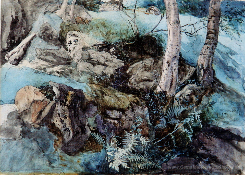 Wir bieten Ihnen eine handgefertigte Reproduktion auf Leinwand des berühmten Kunstwerks 'Felsen und Farne in einem Holz auf Crossmount' von John Ruskin, aus dem Reproduktionsmuseum.