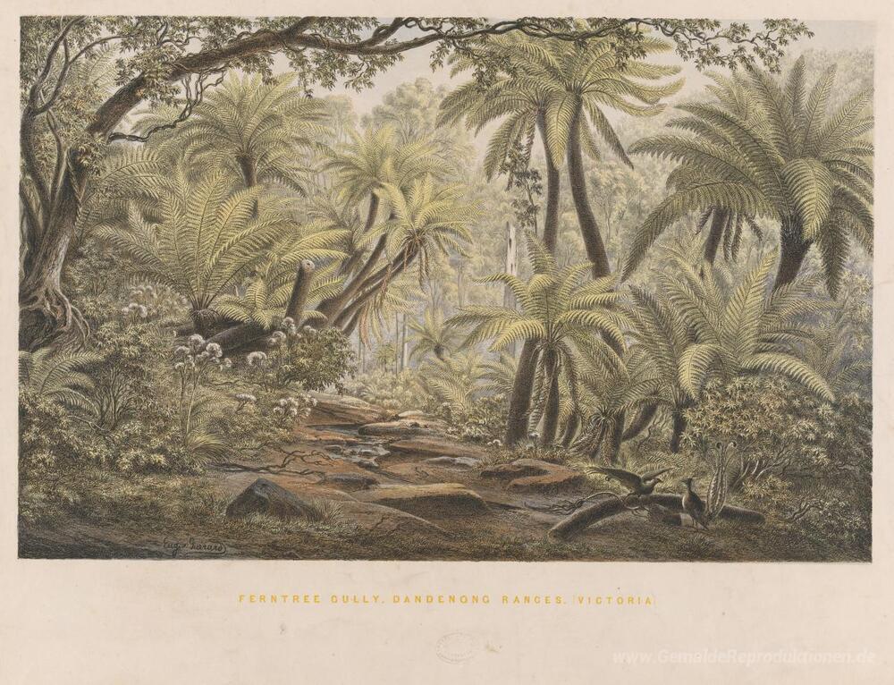 Wir bieten Ihnen eine handgefertigte Reproduktion auf Leinwand des berühmten Kunstwerks 'Ferntree Gully, Dandenong Ranges, Victoria' von Eugene von Guerard, aus dem Reproduktionsmuseum.